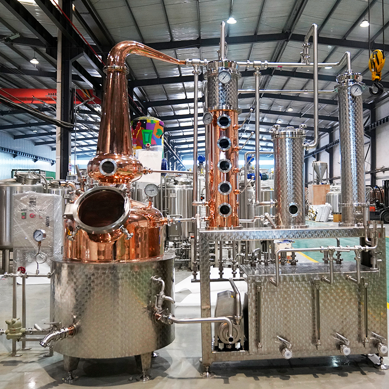 The 600l distillery equipment consists of a pot made of copper, glass, and copper columns combined, a partial condenser, and a condenser, which are heated using steam or electricity. The distillery equipment is a single unit designed to meet and exceed the needs of start-up distilleries and can be used as advanced test distillery equipment for mature distilleries of whisky, gin, fruit brandy, rum, wine spirits. Tiantai provides a complete distillation process system including mash tun, fermentation tank, spirit storage tanks, wine tanks, etc.