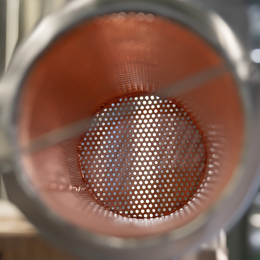 Eine Schlüsselinnovation bei der Dampfinfusion ist der Wacholderkorb, ein entscheidendes Instrument für die präzise Extraktion der Botanicals, der in der Regel aus rostfreiem Stahl oder Kupfergeflecht besteht und in den Hals der Brennblase oder in den Dampfkanal eingesetzt wird. Sie halten Wacholderbeeren und andere pflanzliche Stoffe ohne direkten Kontakt mit der Grundspirituose. Die aufsteigenden Dämpfe durchströmen den Korb und extrahieren sanft und kontrolliert ätherische Öle und Aromastoffe.